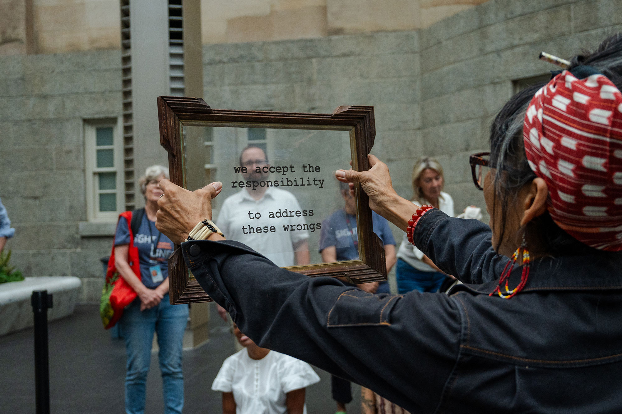 Ritual Intervention: Sightlines was activated by artist Tina Villadolid at the Smithsonian American Art Museum's Kogod Courtyard in 2024, in response to recent revelations that the Smithsonian had secretly collected human remains in the early 1900s to aid in pseudoscientific research proposing white supremacy. Villadolid's series of Ritual Intervention shed light on lesser-known Filipino histories throughout the United States. In this case, she laid focus on the Filipinos whose brain samples were acquired without consent, and which have been part of the Smithsonian's collections for over a century.