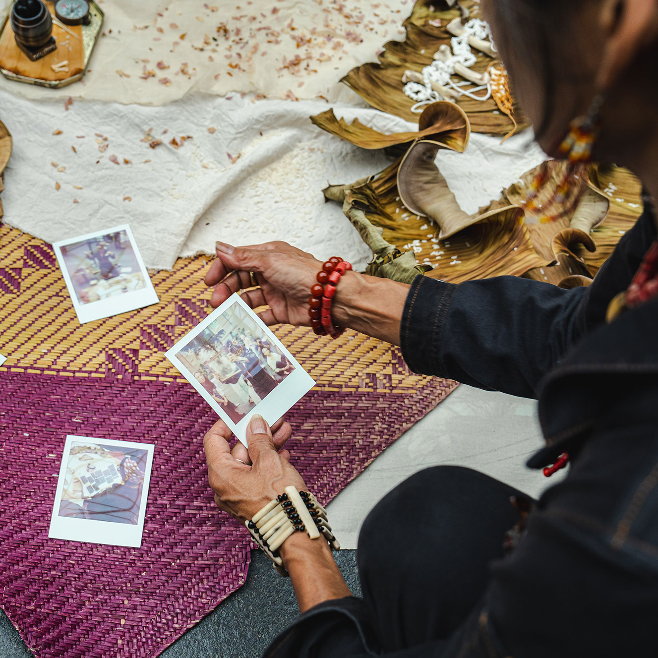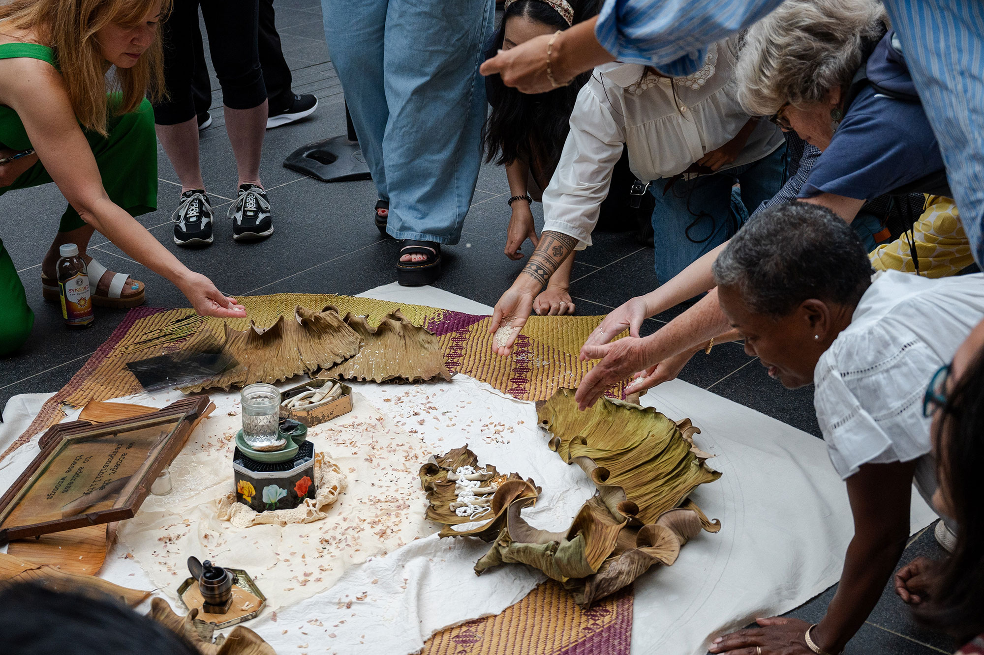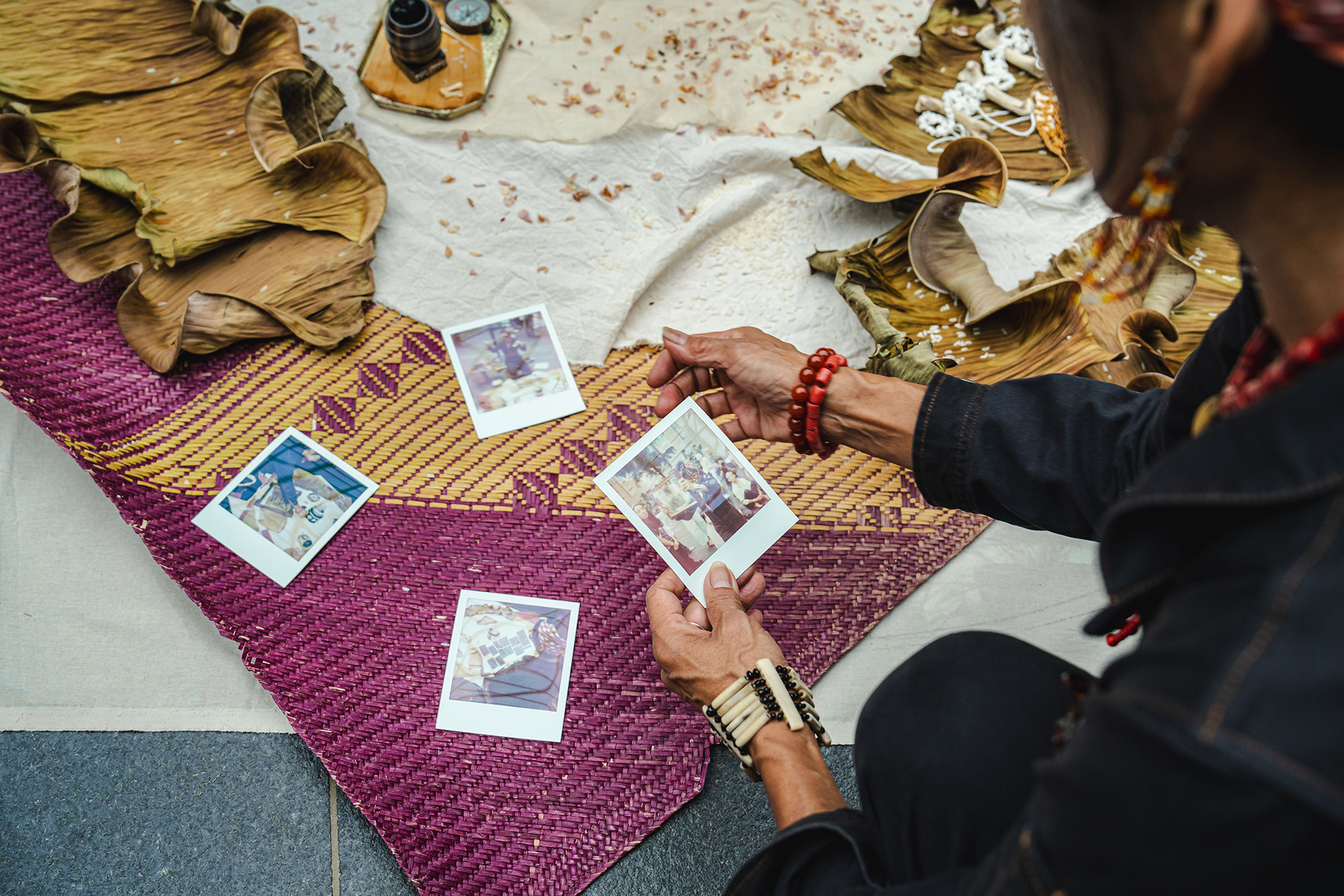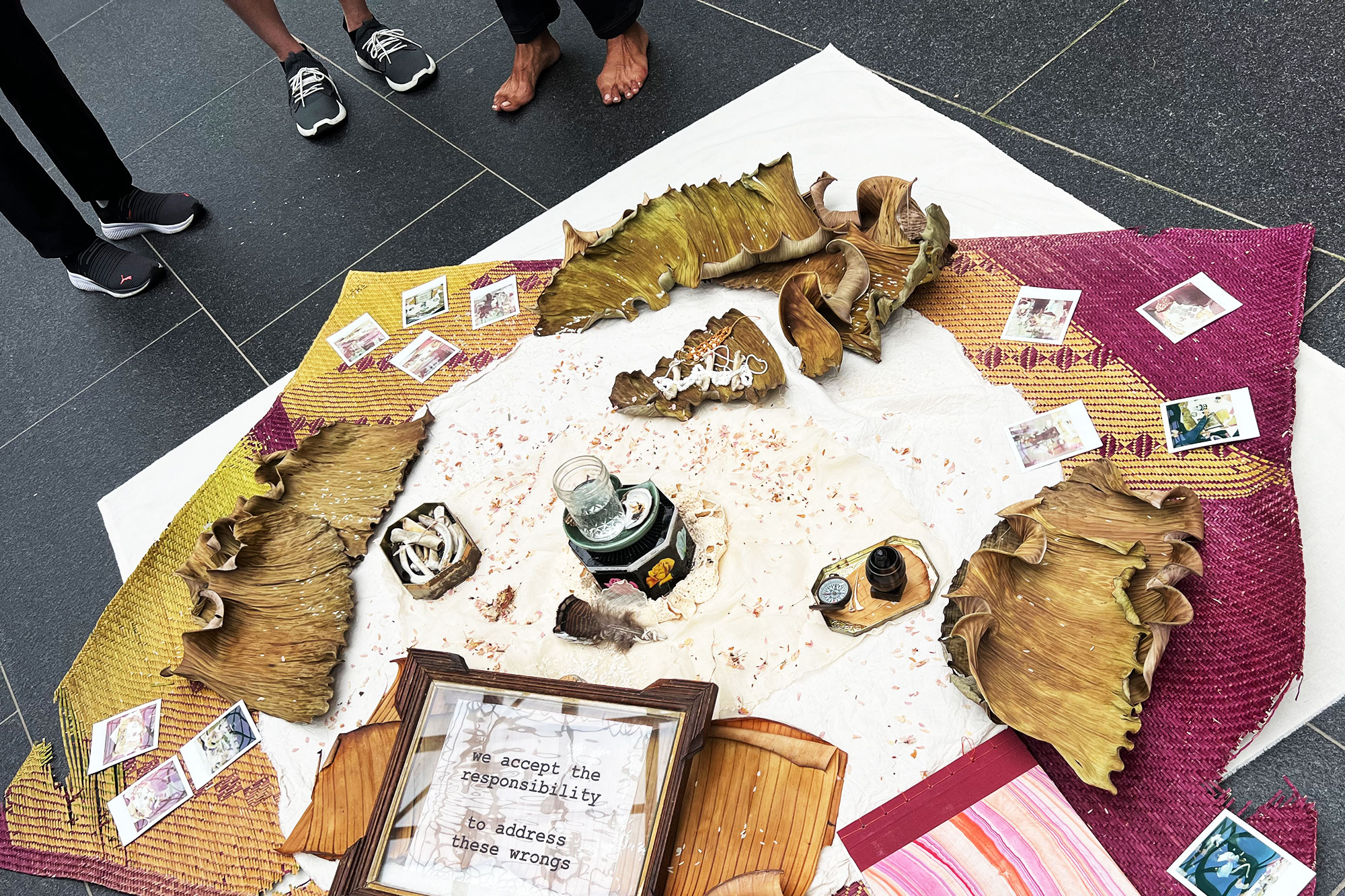 The activation, which took place at the opening of the exhibition Sightlines: Chinatown and Beyond, expanded the notion of Washington, D.C.'s "local community" by acknowledging those whose bodily remains have been put in storage in the region. Using natural materials of the Philippines, quotes from Secretary Lonnie Bunch's official response to the investigation, and polaroid photos taken at the site of the intervention, Villadolid met the moment of reckoning with an approach to bring people together, honor her ancestors, make space to heal.
