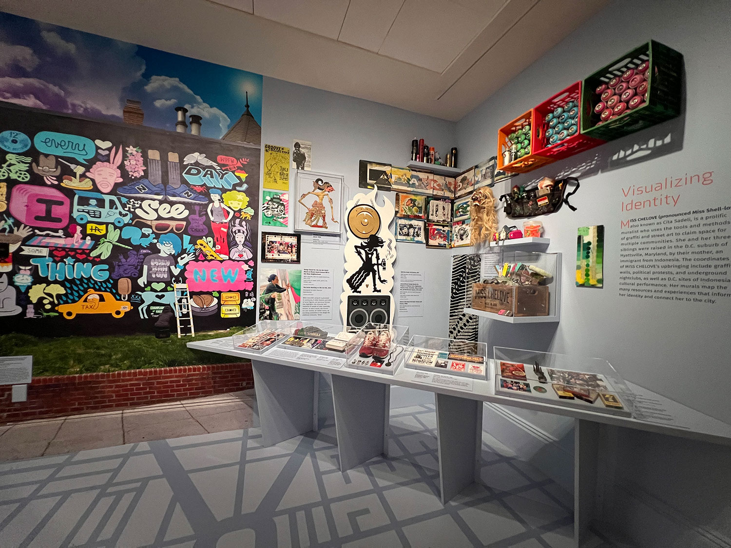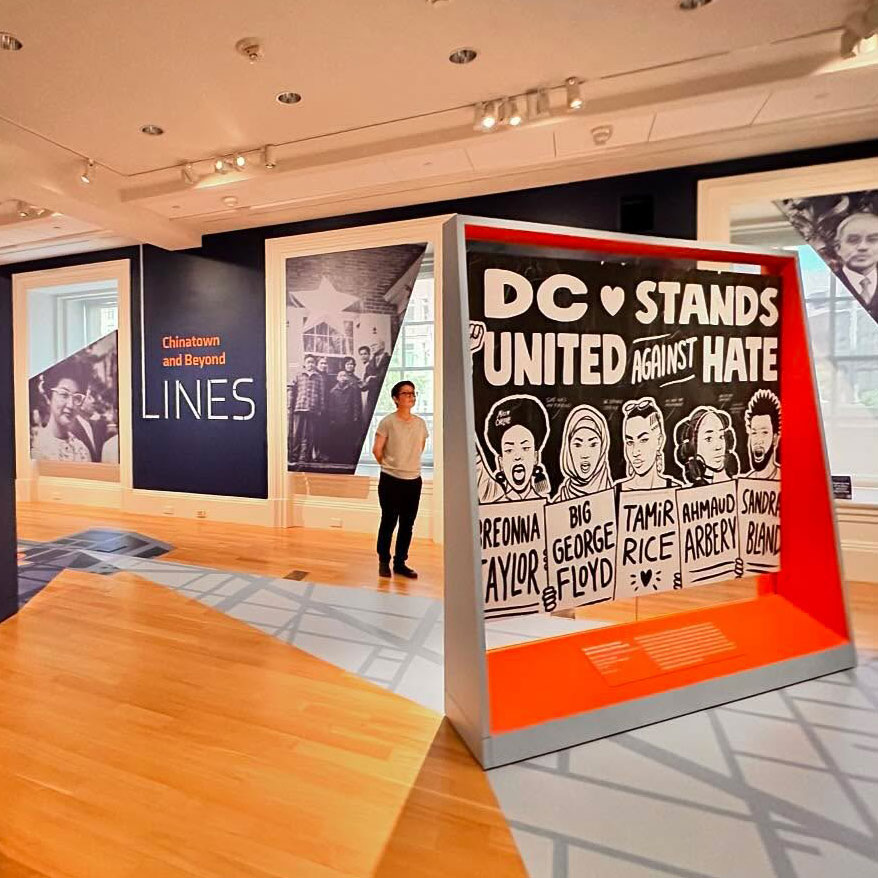 Sightlines: Chinatown and Beyond was an exhibition at the Smithsonian American Art Museum (2024-2025) that highlighted the complex history of Asian Americans living and working in Washington, D.C. from the 1960s to present day. The exhibition was groundbreaking through its hyper-local focus on the surrounding neighborhood of a museum that typically features broad national narratives, and its attention to artists and mediums unconventional to the museum’s exhibitions: the social architect Alfred Liu; the martial arts collective Simba Dojang; the grassroots publication Eastern Wind; and the muralist Cita “CHELOVE” Sadeli.
